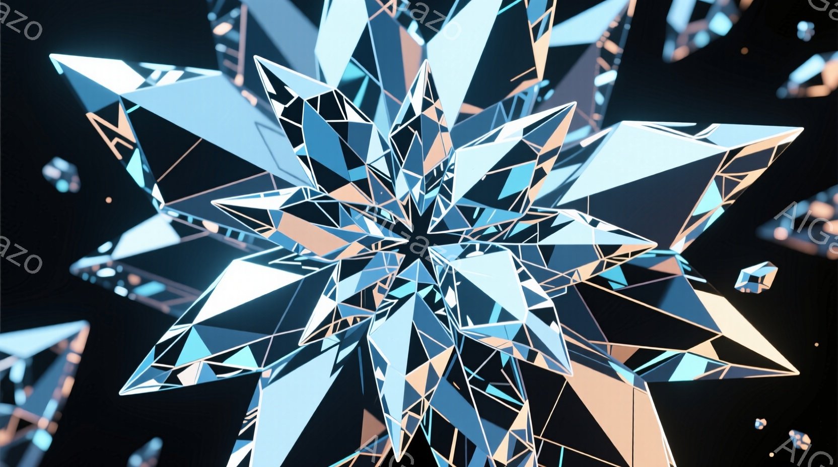 複雑な多面体構造が、暗い背景に浮かび上がっています。光沢のある水色と白を基調とした幾何学模様は、まるで凍てつく雪の結晶のようです。周囲にも同様の構造物が散らばっており、幻想的で未来的な雰囲気を醸し出しています。