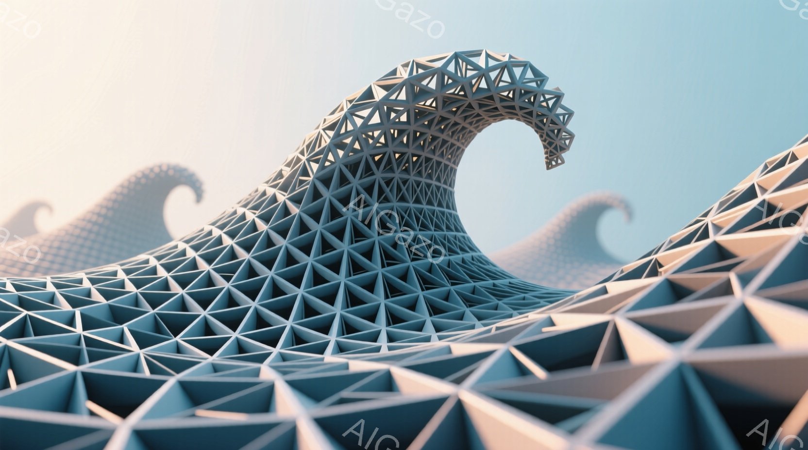 この画像は、三角形の要素が組み合わさってできた、うねる波のような構造物のクローズアップです。全体的に白っぽい色調で、光沢のある質感と影が、幾何学的な形状を際立たせています。背景は暗く、構造物が浮かび上がるような効果を作り出しており、近未来的な雰囲気を感じさせます。