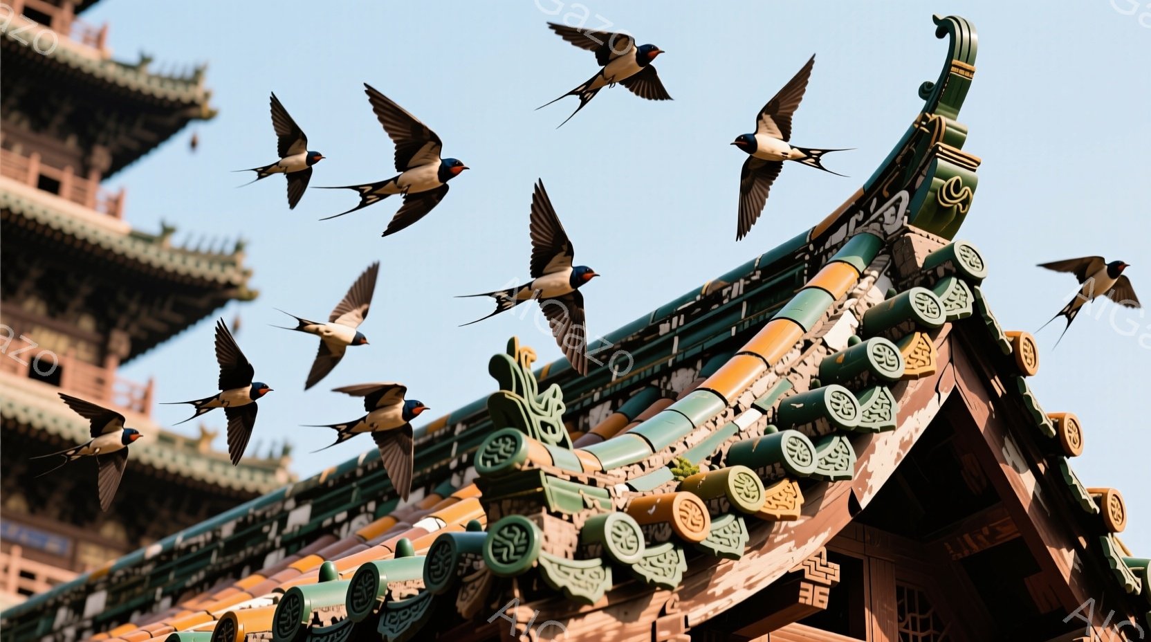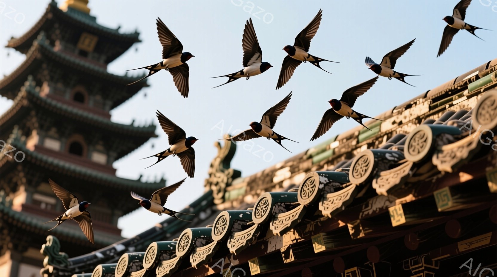 寺院の屋根に数羽のツバメが舞っている様子が捉えられています。屋根は精巧な装飾が施され、背景には伝統的な様式の塔がそびえ立っています。晴れた空と寺院の優美な建築が組み合わさり、静かで平和な雰囲気を醸し出しています。