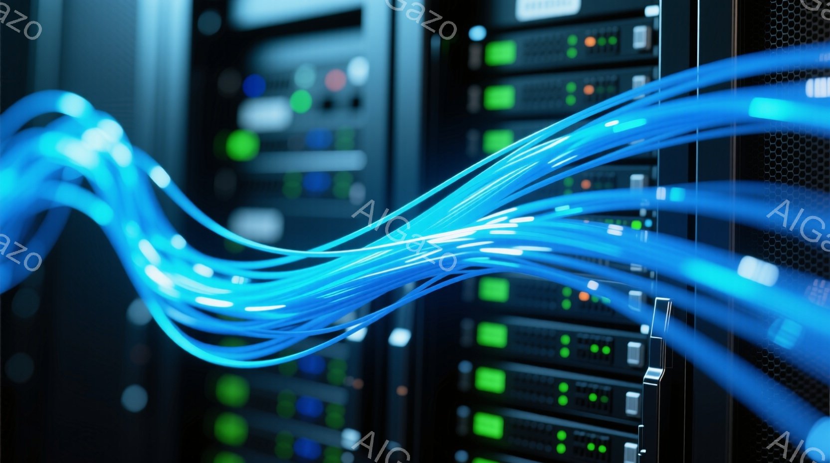 鮮やかな青色のケーブルが、黒色のサーバーラックの間を流れるように配置されている。サーバーラックには緑色の小さなライトが点灯しており、システムの稼働状況を示唆している。全体的に、デジタルインフラストラクチャの複雑さと、高速データ転送のイメージを表現している。