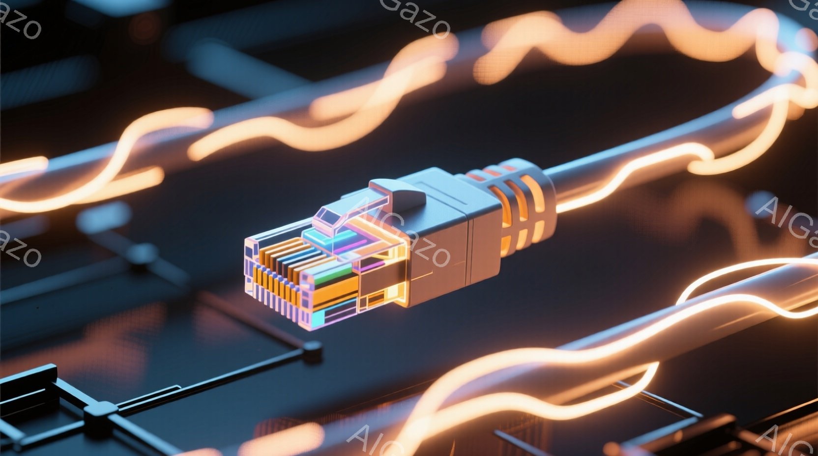鮮やかな光のラインが敷き詰められたキーボード上に、ネットワークケーブルのプラグが配置されています。プラグはオレンジと青の光るラインに囲まれ、キーボードの暗い背景とコントラストをなしています。全体的に未来的な雰囲気で、データ通信やテクノロジーを連想させます。