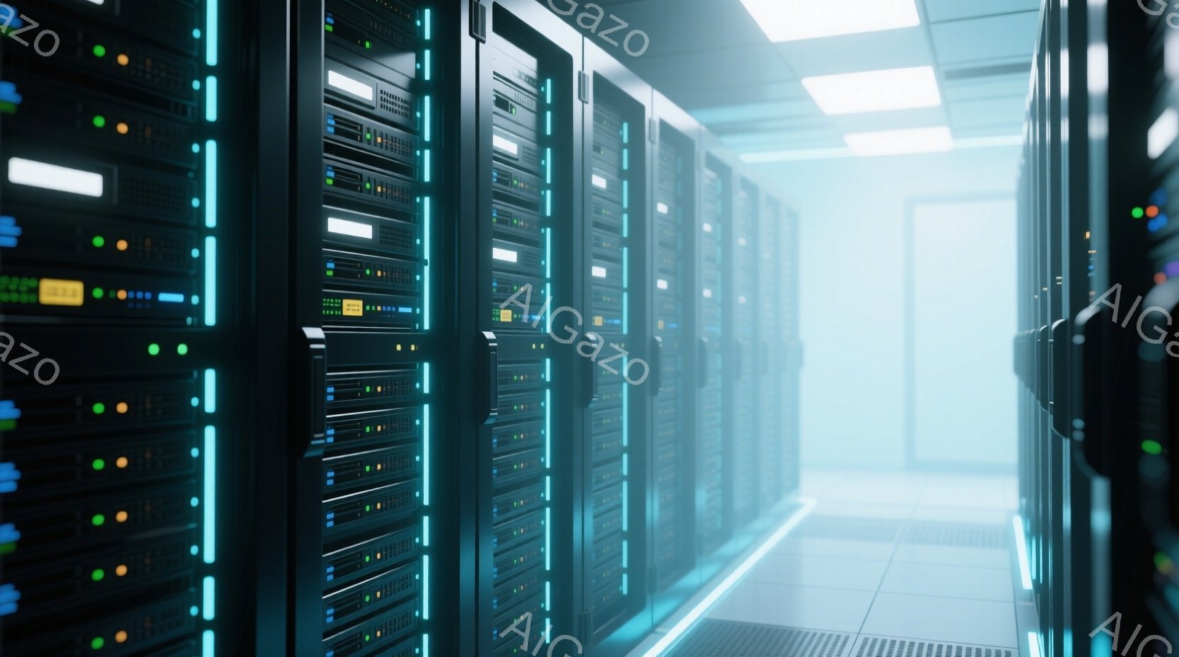 サーバーラックが左右に並び、無限に続く廊下のように見える画像です。ラックには様々な色のランプが点灯しており、青、緑、オレンジなどが確認できます。全体的に冷たい光が照らし出され、未来的なデータセンターの雰囲気を醸し出しています。
