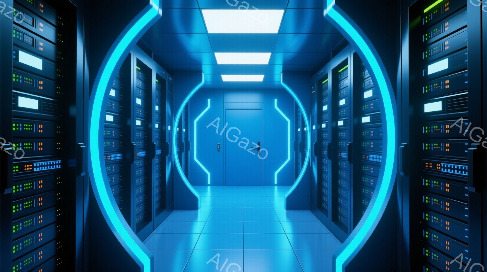 無数のサーバーラックが両側に並び、未来的な青色のトンネルのような空間が広がっている。サーバーラックには緑色の光が点滅し、青色の床面が光を反射している。遠方には明るい光が差し込み、無限に続くデジタル世界の印象を与える。