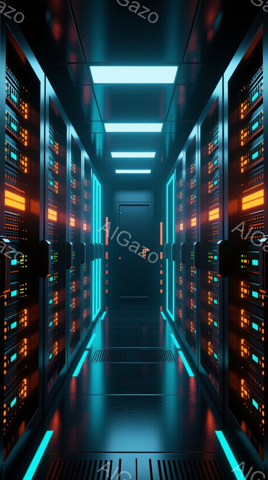 この画像は、青緑色の光が点滅するサーバーラックが両側に並ぶ、廊下のような空間を描写している。床は黒いタイルで覆われ、天井には明るい白い照明が設置されており、未来的な雰囲気を醸し出している。全体的に、技術的な進歩とデータ処理の可能性を感じさせる、クールで静かな空間である。