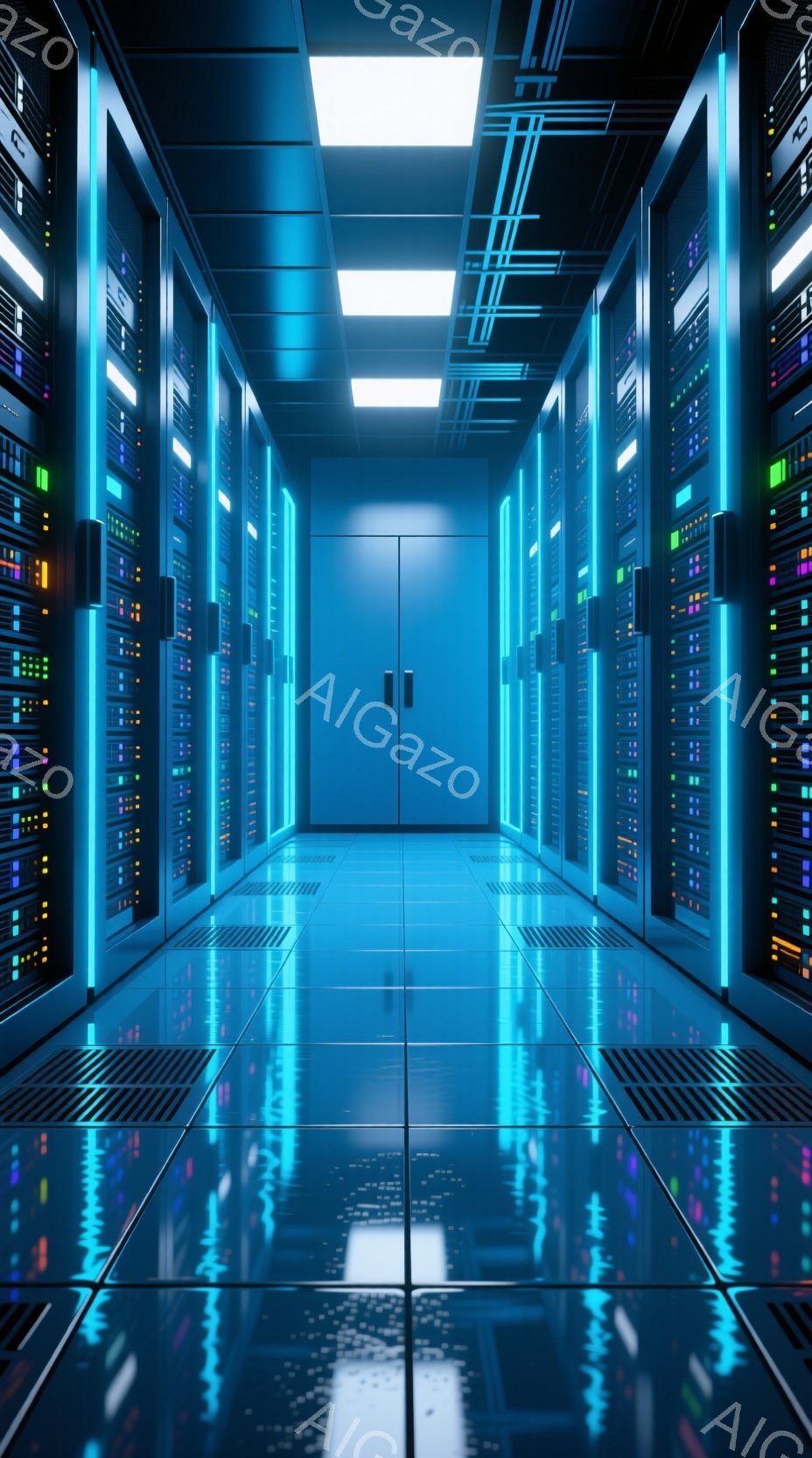サーバーラックが整然と並ぶデータセンターの内部が描かれている。青と緑の光が点滅し、床のタイルに反射して未来的な雰囲気を醸し出している。この空間は非常に整然としており、高度な技術と精密さを感じさせる。