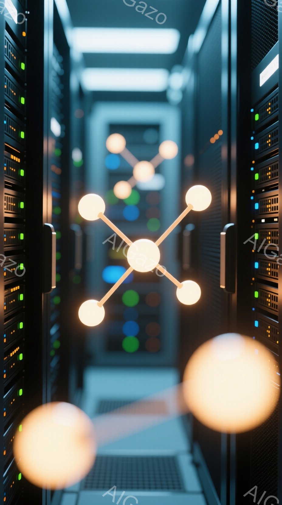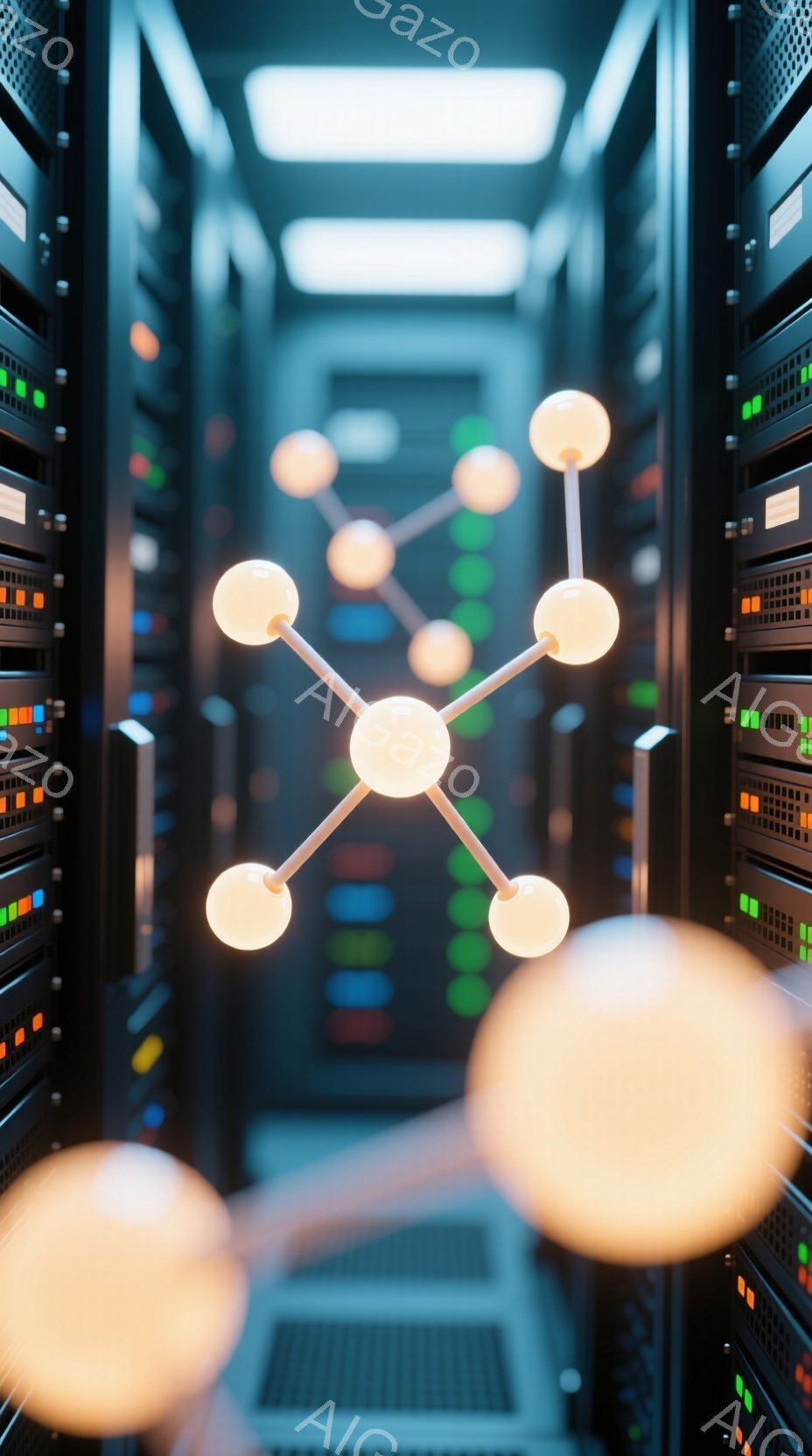サーバー室のような背景に、球体で構成された複雑な構造物が前景にぼんやりと浮かび上がっています。サーバーは様々な色のライトで点滅しており、全体的に未来的で技術的な雰囲気を醸し出しています。構造物はまるで分子モデルのように見え、データやネットワークの概念を連想させます。