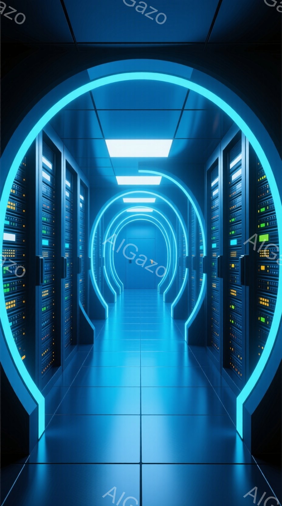 巨大なサーバー室が、青い光で照らされた廊下のように広がっている。サーバーラックが左右に整然と並び、奥へと続く廊下は青色の発光フレームで装飾され、未来的な雰囲気を醸し出している。床面は金属製のグリッドで構成され、全体的に冷たく、技術的な印象を与える空間である。