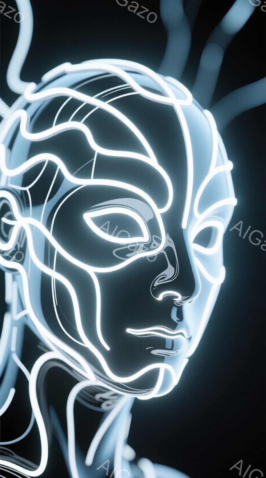 暗い背景に、光る白い線で構成されたルチャリブレのマスクが浮かび上がっています。マスクは顔の輪郭、目、鼻、口を強調し、ダイナミックでエネルギッシュな印象を与えます。線は曲線的で流れるようで、動きと躍動感を表現しています。