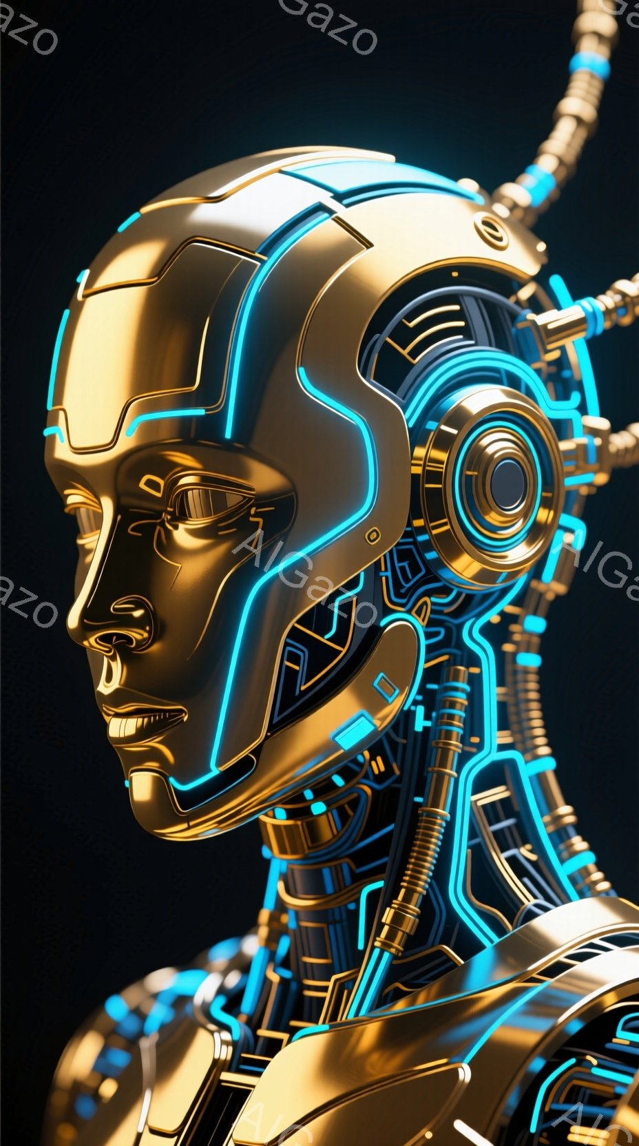未来的なロボットが、デジタルな粒子で構成されたような外観で立っている。ボディはメタリックな質感で、青とオレンジの光が複雑な回路パターンを照らし出している。背景は暗く、様々な色の光る粒子が散りばめられ、近未来的な雰囲気を作り出している。