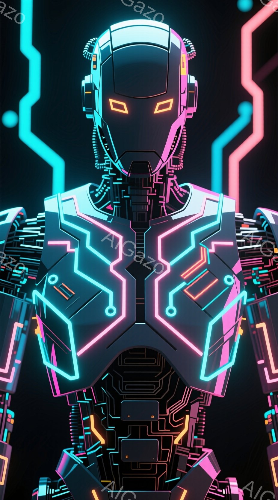 この画像は、ネオンライトで縁取られた未来的なロボットの胸部と肩部を描いています。複雑な回路模様が身体全体に走り、鮮やかなピンク、青、オレンジ色が光を放っています。黒色の背景がロボットの光を強調し、サイバーパンクな雰囲気を醸し出しています。