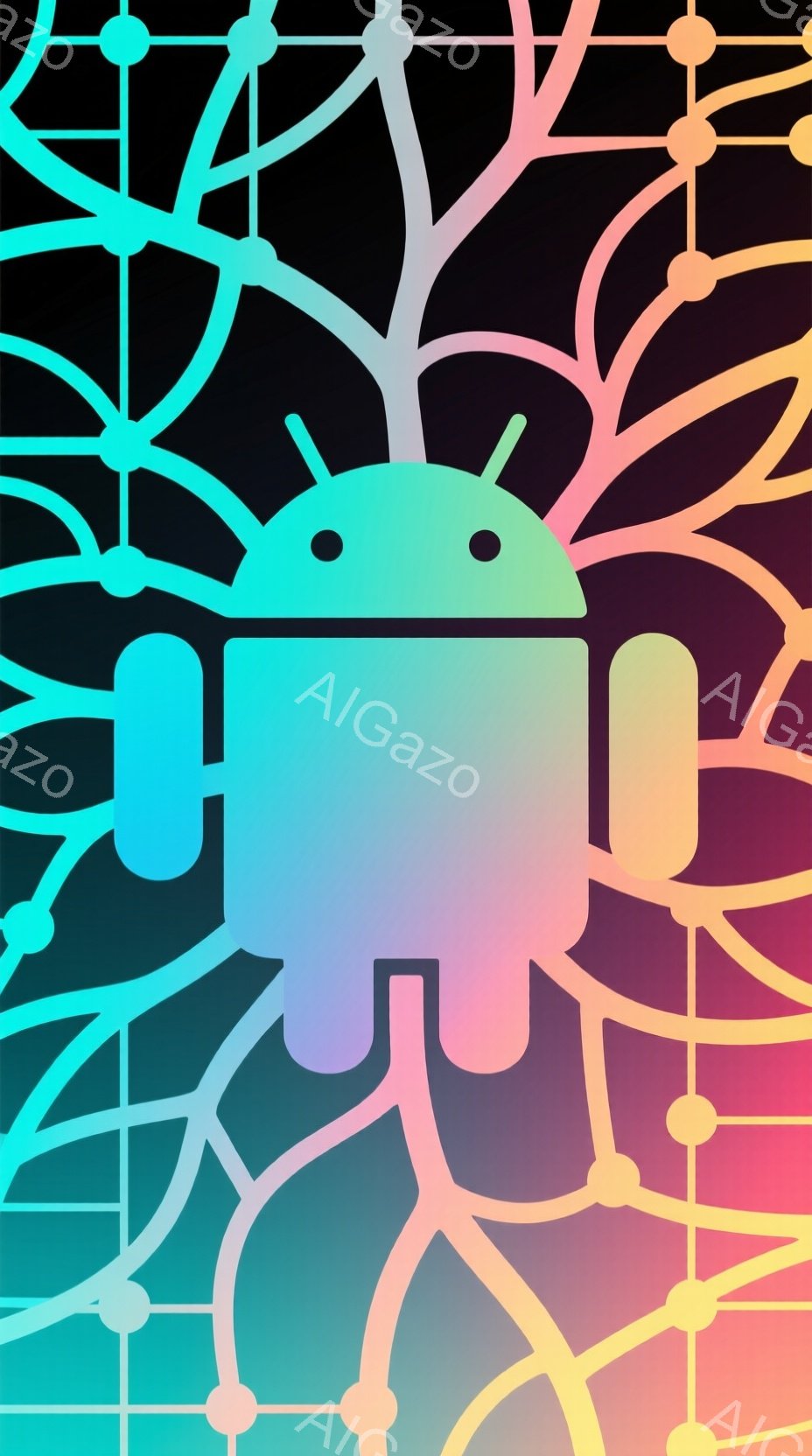 鮮やかなグラデーションがかったアンドロイドロボットが、黒い背景に浮かび上がっています。ロボットの身体は、淡い紫、青、緑の色調で彩られ、その周りには、光沢のある流線形の模様が絡みつくように広がっています。全体的に未来的で、抽象的な雰囲気があり、サイバーパンク調の芸術作品を彷彿とさせます。