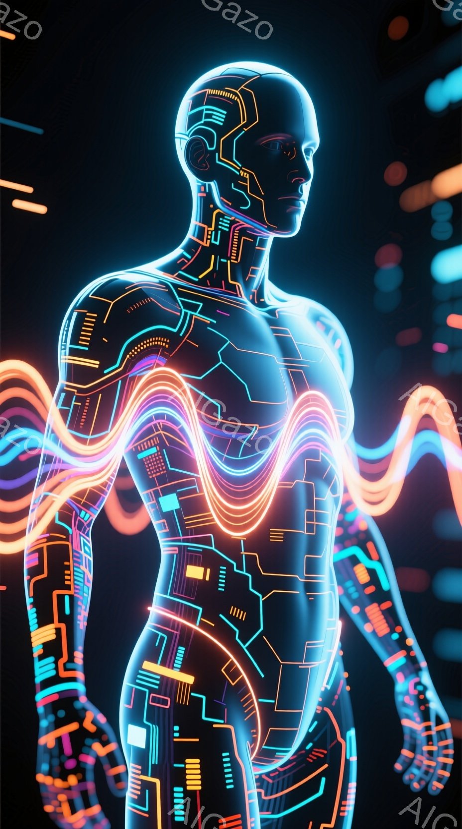 この画像は、未来的な回路模様が身体に刻まれた男性の姿を描いています。彼は片手を前に伸ばし、もう片手は身体の横に置いており、その姿勢は静かで力強い印象を与えます。背景は暗く、明るい色の点々が散りばめられており、SF映画のような、テクノロジーと生命が融合した雰囲気を醸し出しています。