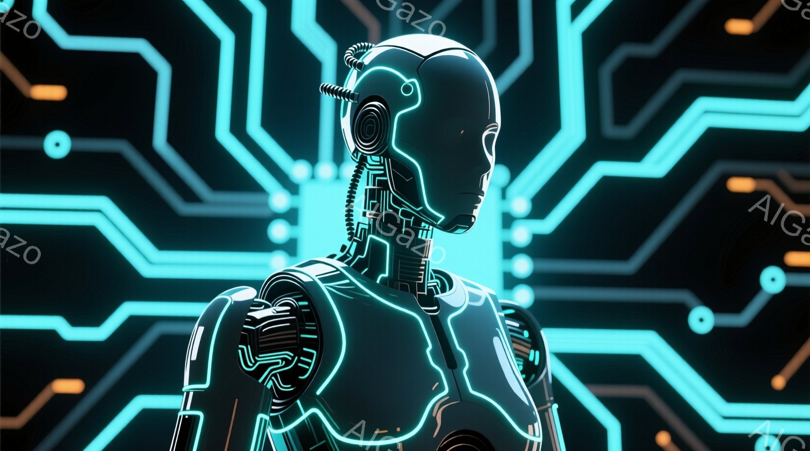 この画像は、ネオンカラーのラインで構成された人物の顔のクローズアップです。顔は幾何学的な形状で表現され、未来的なロボットのような印象を与えます。背景は暗く、ぼやけた黒色で、顔のネオンラインが際立っています。