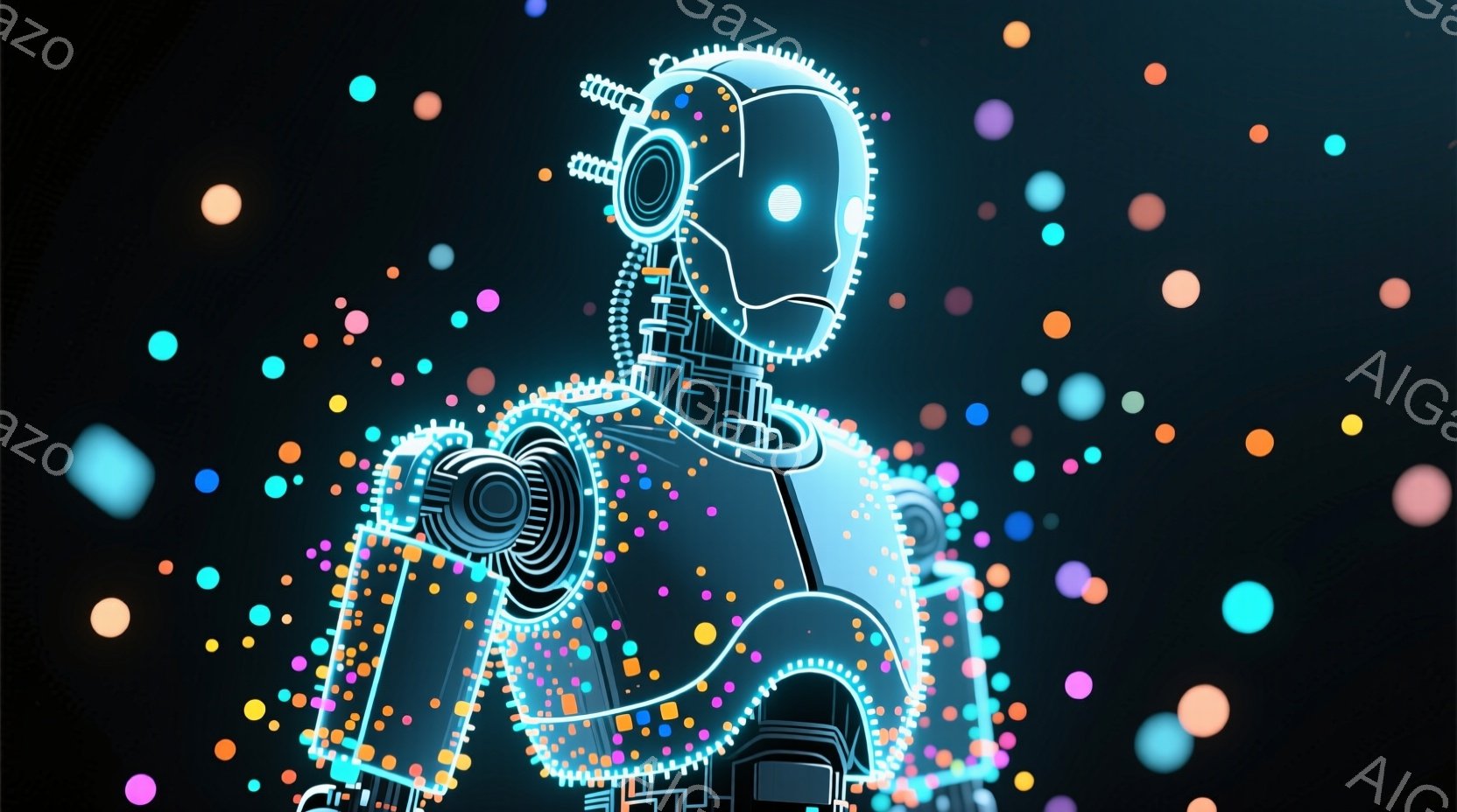 この画像は、未来的なロボットの半身像が描かれています。ロボットは、白い光る線で構成され、内部構造が露出したようなデザインです。背景は暗く、カラフルな小さな光の粒子が散りばめられており、近未来的な雰囲気を醸し出しています。