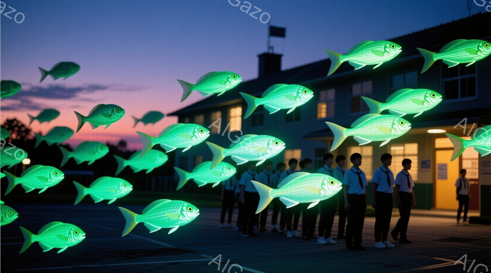 制服を着た子供たちが一列に並んで立っており、皆同じ方向を見つめている。彼らの周りには、緑色に光る魚が群れをなして漂っているように配置されている。背景は夕暮れ時の学校の体育館のようで、薄暗い空が幻想的な雰囲気を醸し出している。
