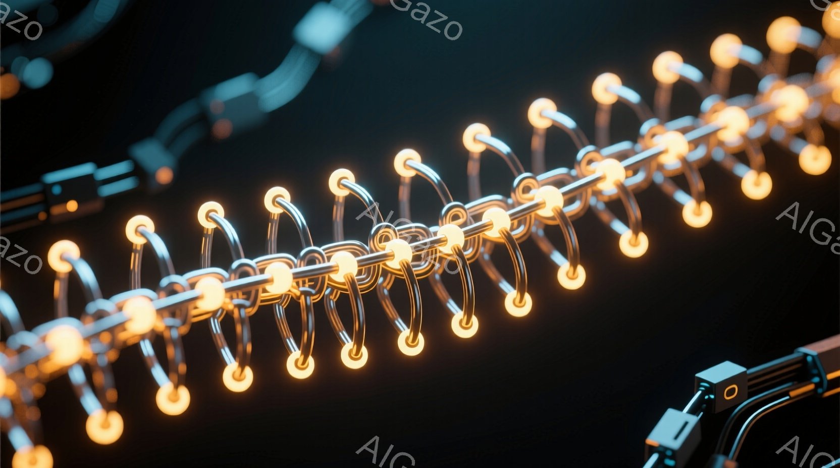 黄金色の光を放つ球体と金属製の鎖が連なった画像である。球体は滑らかで明るく輝き、鎖はそれらを繋ぎ止めている。背景は暗く、球体と鎖の光が際立つことで、どこか神秘的で未来的な雰囲気を醸し出している。