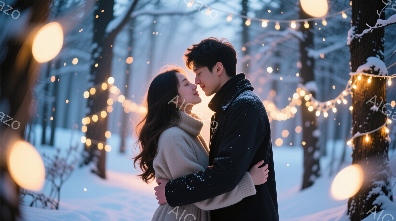 雪が降る夜の橋の上に、カップルが立っています。男性は黒いコートを着ており、女性は長い茶色の髪と黒いコートを着ています。二人はお互いを抱きしめ、キスを交わしています。背景には雪に覆われた建物と街灯があり、雪が降っている様子が見られます。