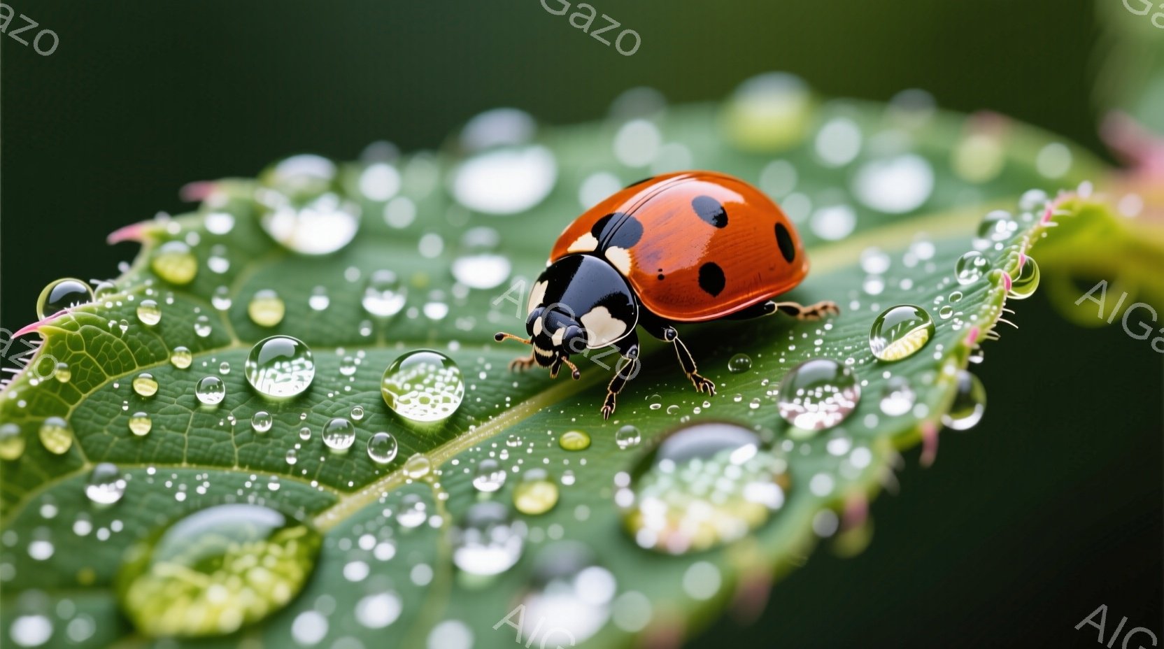 鮮やかな赤色のテントウムシが緑色の葉の上を歩いている。葉の上には水滴が散らばっており、朝露または雨上がりの様子を思わせる。背景は緑色のぼやけであり、自然の中で生きる小さな昆虫の生命力を感じさせる。