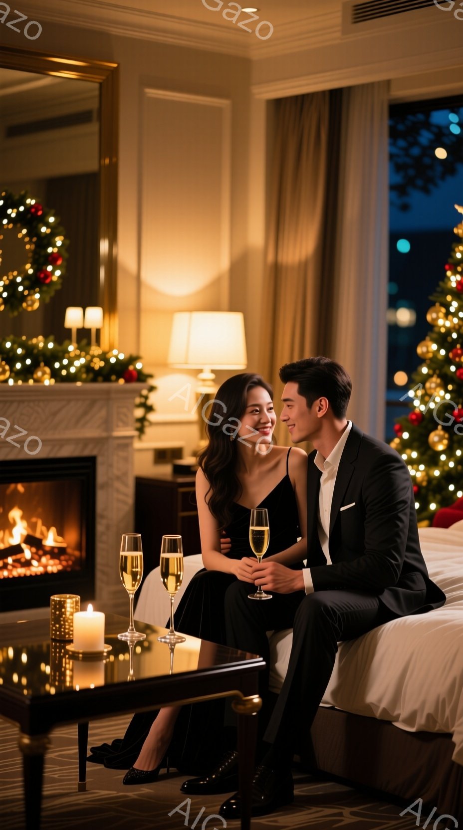 雪に覆われた森の中で、二人のカップルが抱き合っている。女性は長い黒髪で、白いセーターを着ており、男性は黒いコートを着ている。彼らの顔には愛らしさがあり、お互いを見つめている。背景には木々があり、その間に暖かい光の装飾が吊り下げられている。雪が降り、静かな冬の雰囲気が漂っている。