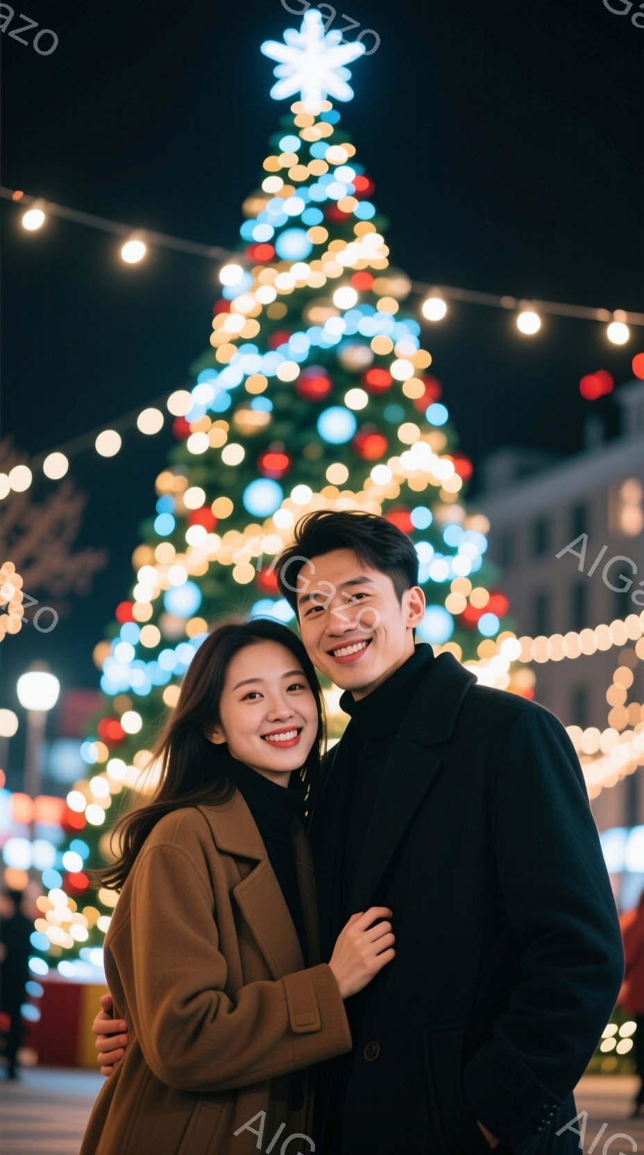 雪が降る夜の街角で、カップルが並んで立っています。男性は黒いコートを着ており、女性は長い髪と黒いコートを着用しています。二人は互いに向き合っており、微笑んでいるように見えます。背景には高層ビルがあり、その間に大きなクリスマスツリーが飾られています。街灯の光が雪に反射し、幻想的な雰囲気を作り出しています。