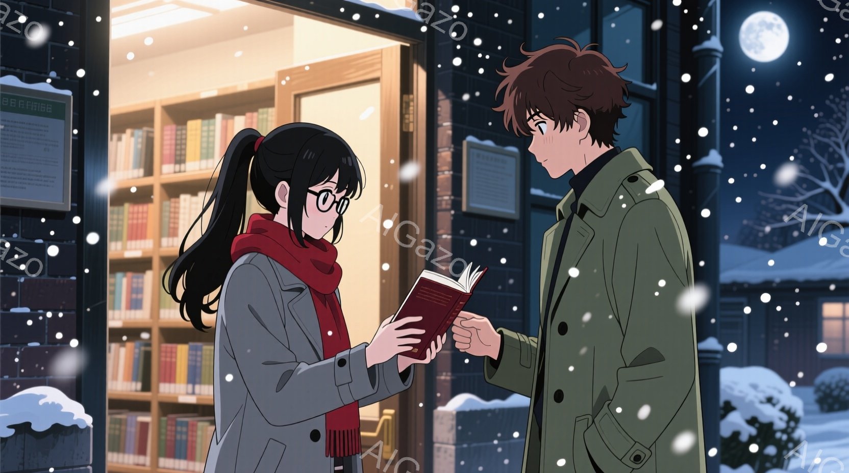 雪が降る冬の日に、二人のキャラクターが歩いている様子が描かれています。女性は茶色の髪で、ベージュのコートと白いセーターを着ており、笑顔で手を広げています。男性は黒い髪で、青いコートを着ており、女性の手を握りながら話している様子です。背景には雪に覆われた木々と建物があり、雪が舞っています。