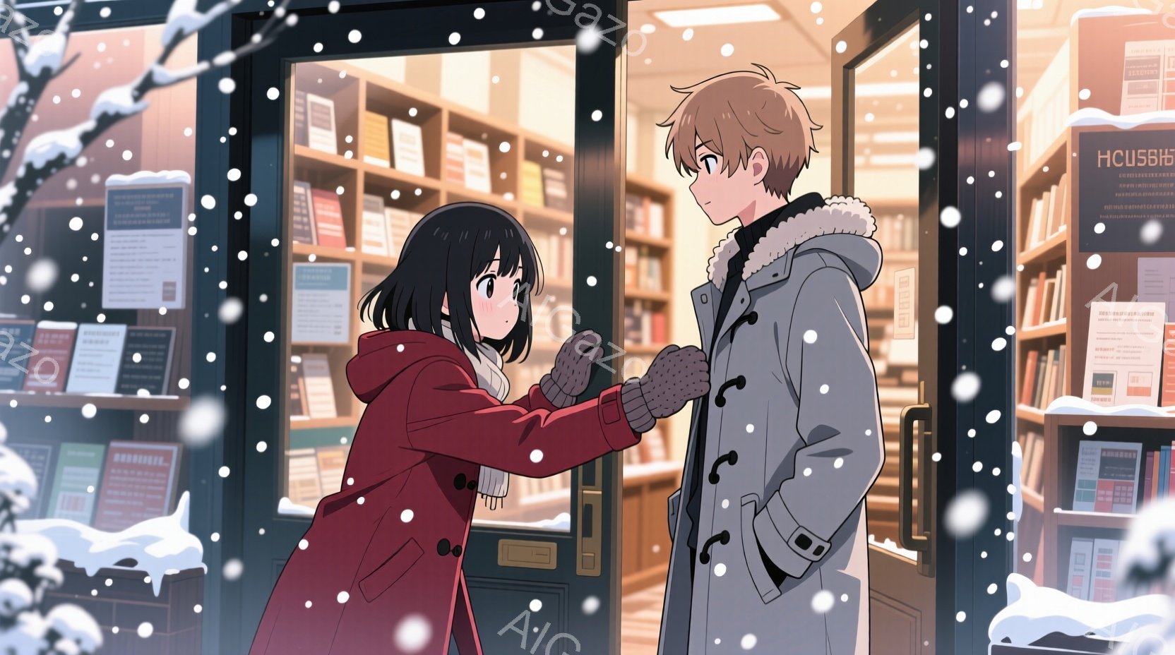 左側の女性は長い茶色の髪を流し、白いコートと茶色のマフラーを着ています。彼女の表情は少し驚いたようなもので、右側の男性を見つめています。男性は黒い髪で、緑色のコートとグレーのマフラーを着ており、手を広げて何かを説明しているように見えます。背景には雪が積もった橋と川があり、遠くには山々が見えます。空は薄い青色で、雪が降っている様子が描かれています。