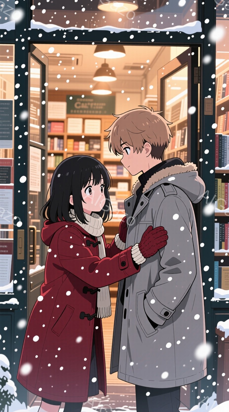 左側の女性は長い茶色の髪を肩まで垂らし、白いコートと茶色のマフラーを着用しています。彼女の表情は少し驚いたようなもので、右側の男性を見つめています。男性は背中を向けており、緑色のコートと茶色のマフラーを着用しています。背景には雪が積もった橋と川があり、夜の空には星が散りばめられています。