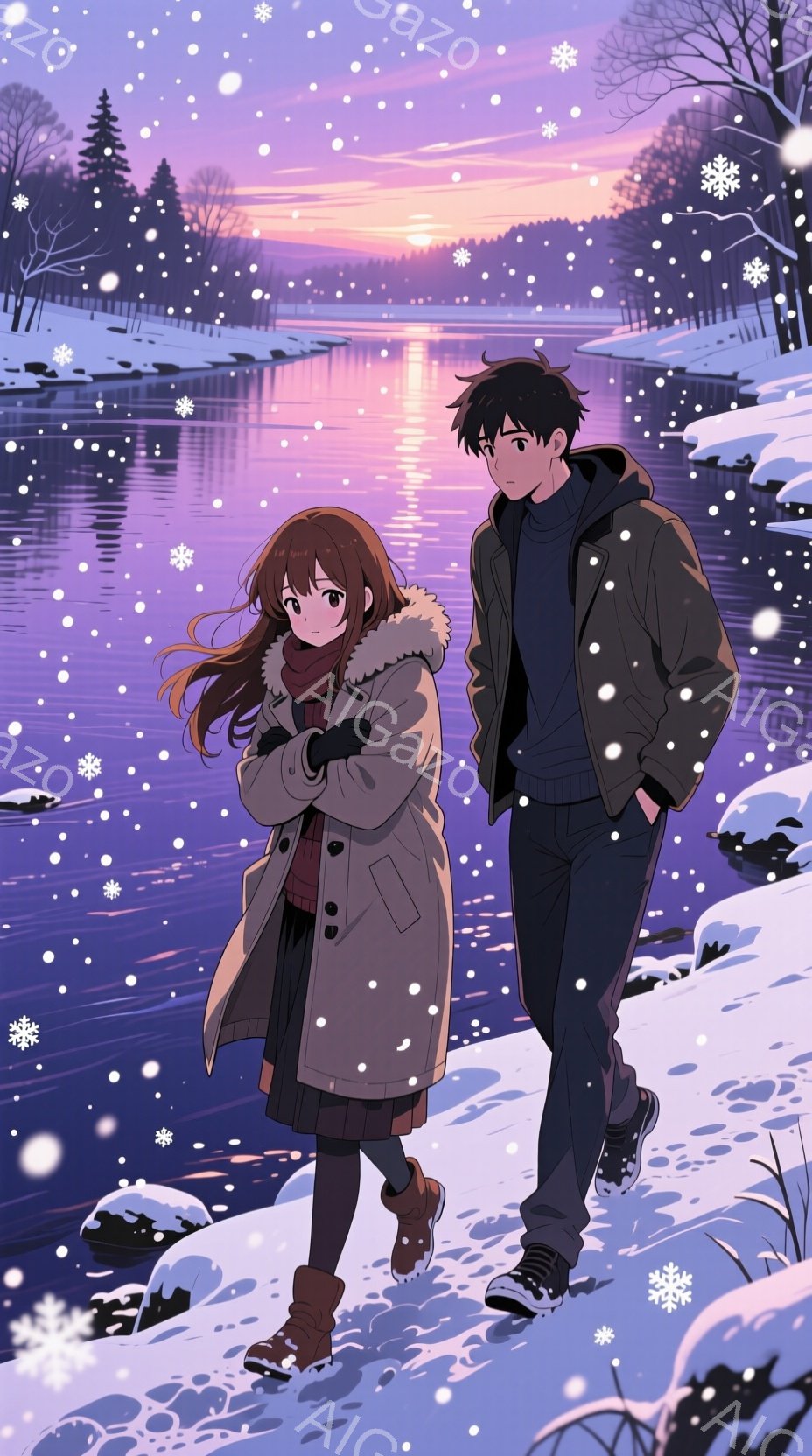 雪が降る冬の街角で、二人のカップルが会話をしている様子が描かれています。女性は長い茶色の髪を持ち、茶色のコートを着ており、男性は黒い髪で、ベージュのコートを着ています。二人とも微笑んでおり、互いに近づいて話しているように見えます。背景には雪に覆われた建物があり、窓には雪が積もっています。街灯の光が暖かく、雪が降る静かな雰囲気が漂っています。