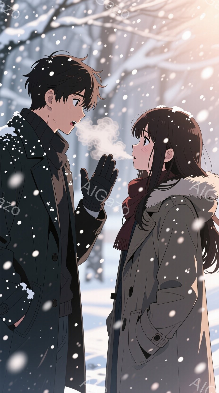 雪が降る通りを歩く女性の後ろ姿が描かれています。彼女の髪は黒く、肩までの長さで、風に吹かれながら揺れています。彼女の表情は少し寂しそうで、何かを考えているように見えます。背景には雪に覆われた建物があり、街灯の光が暖かみのある雰囲気を作り出しています。