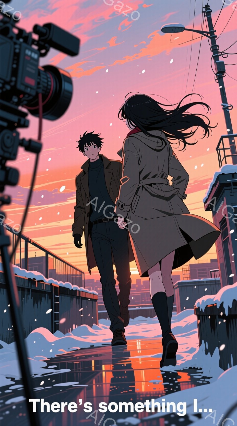 雪が降る夜の街角で、二人のキャラクターが会話をしている様子が描かれています。女性は茶色のコートと赤いスカーフを着ており、髪はショートカットです。男性は青いコートを着ており、髪は長めです。女性は舌を出すポーズをとり、男性は驚いた表情をしています。背景には雪が降り、街灯が光を放ち、電車が通り過ぎています。