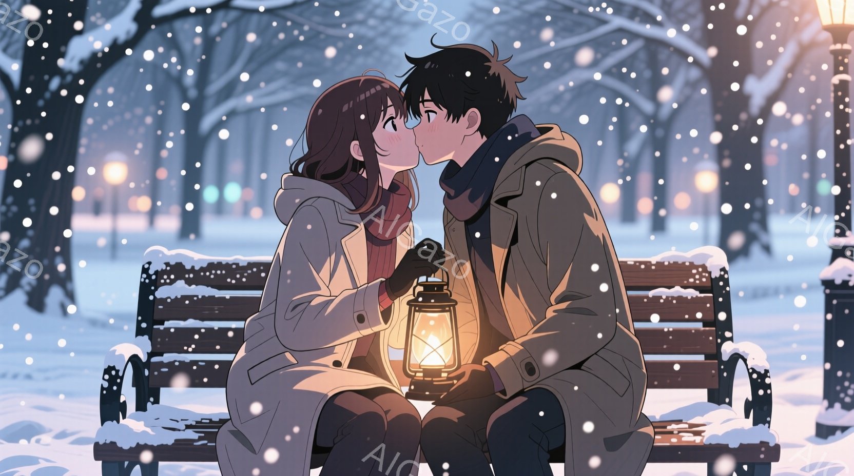 雪が降る駅のプラットフォームで、カップルがキスをしている様子が描かれています。女性は長い黒髪で、白いコートを着ており、男性は黒髪で、青いコートを着ています。二人は手を握り合い、お互いを深く見つめています。背景には雪が降り、駅の構造が見えます。照明は明るく、雪の光が独特な雰囲気を作り出しています。