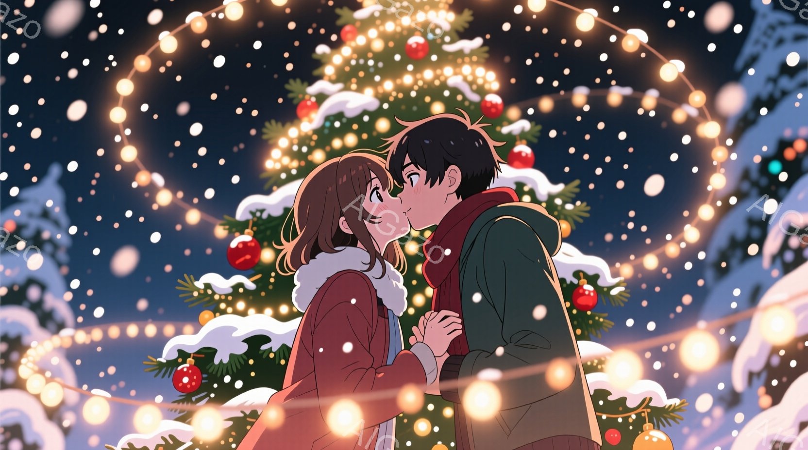 この無料AI生成画像「雪が降る駅のプラットフォームで、カップルがキスをしている様子が描かれています。女性は長い黒髪で、白いコートを着ており、男性は黒髪で、青いコートを着ています。二人は手を握り合い、お互いを深く見つめています。背景には雪が降り、駅の構造が見えます。照明は明るく、雪の光が独特な雰囲気を作り出しています。」は、2025年11月16日に作成されました。 サイズは 1664×928px の高解像度で、商用利用も可能なフリー素材として提供しています。