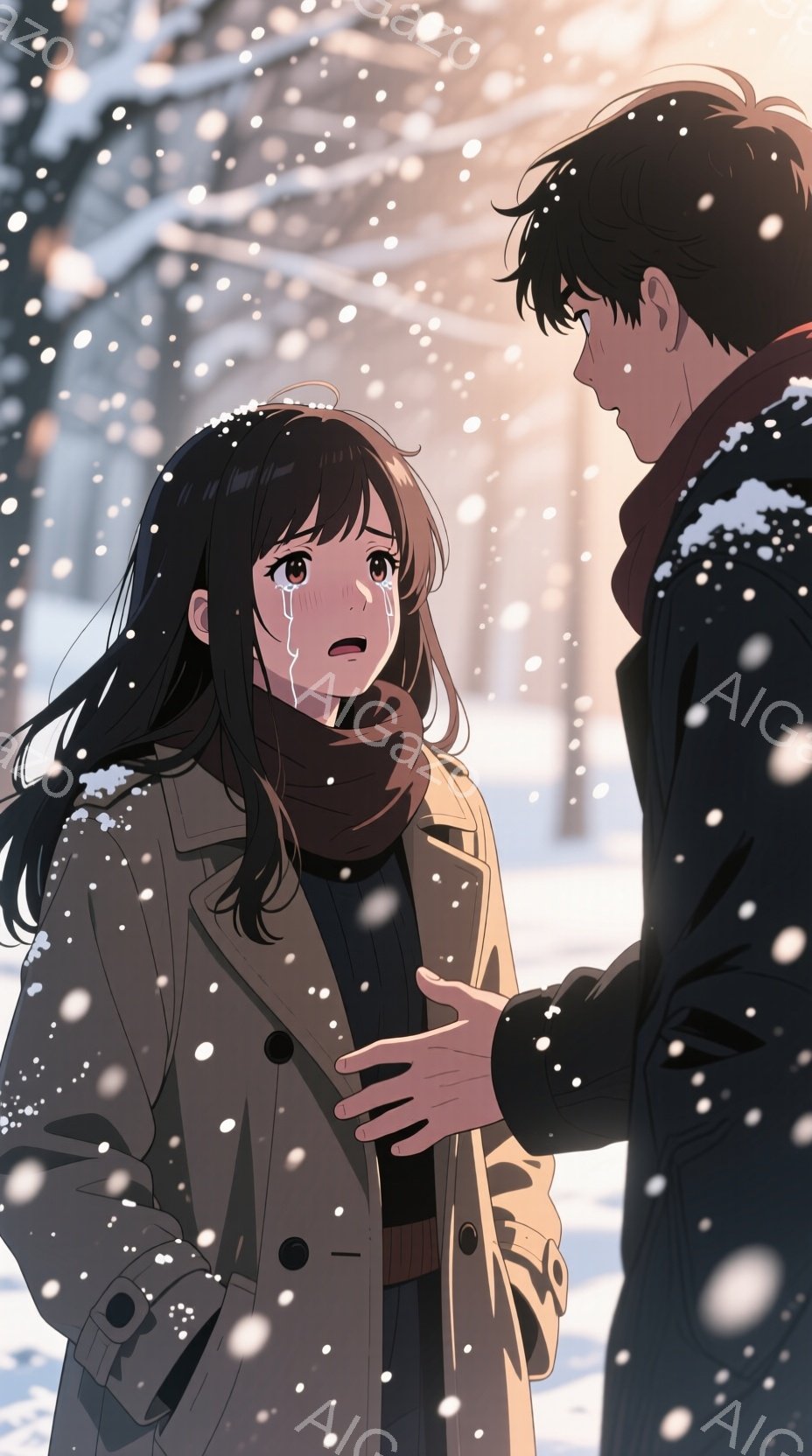 雪が降る冬の街角で、二人の若者が会話をしている様子が描かれています。男性は黒いコートを着ており、女性は茶色のコートと白いスカーフを身にまとい、手を組んで寒さを防ぎます。男性は目を大きく見開き、何かを話している表情で、女性は驚いたような表情を浮かべています。背景には雪に覆われた建物と、暖かそうな光が差し込む大きな窓が見えます。