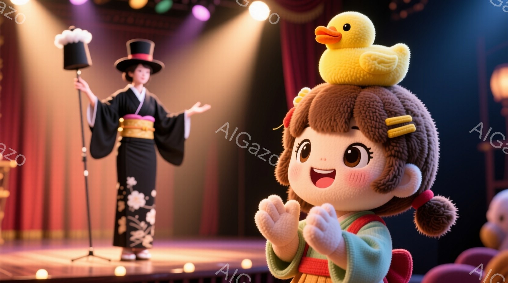 舞台の上で、和服を着た女性がマイクを持って歌っている。彼女の頭には、黄色いカエルのぬいぐるみが乗っている。前景には、大きな目と丸い鼻を持つキャラクターがいて、手を広げて喜んでいる様子。背景には赤いカーテンがあり、照明が舞台を照らしている。