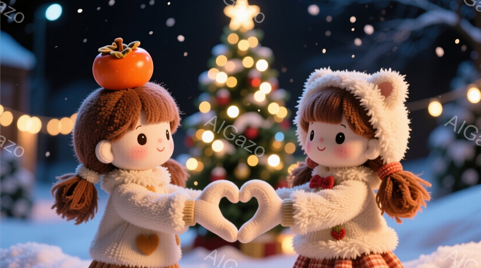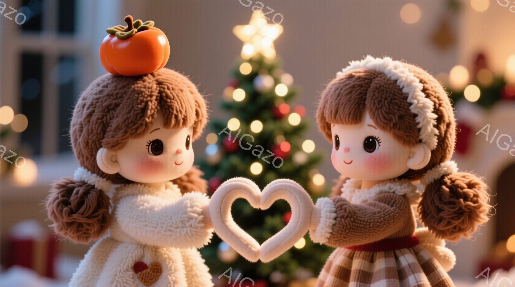 2人の女の子がクリスマスの背景の前でハートの形を作っています。彼女たちは茶色の巻き毛の髪をしており、片方の頭にはカボチャが乗っています。温かみのある表情で、白いフリル付きの茶色のコートを着ています。