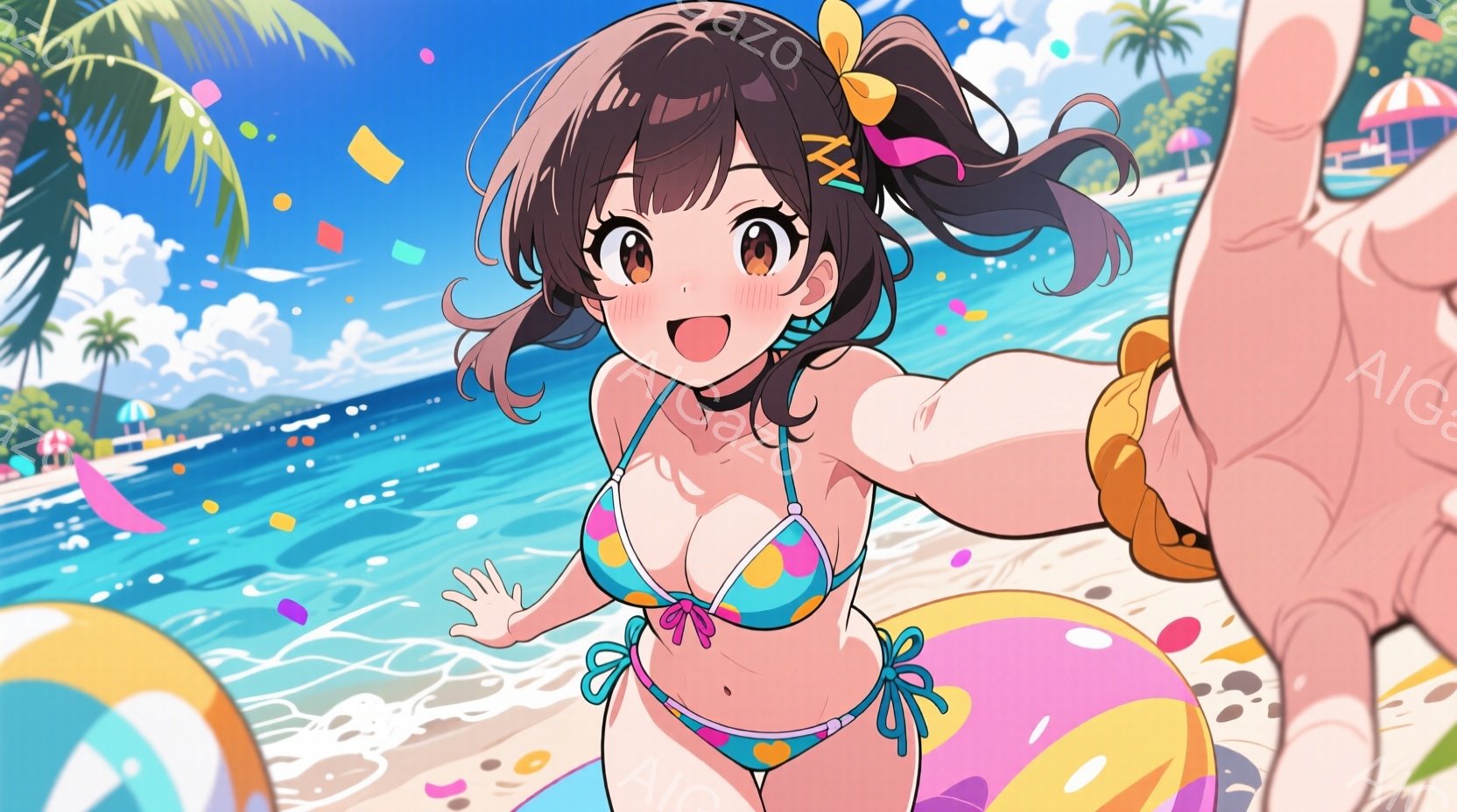 画像には、水着姿の少女がプールから飛び出そうとしている姿が描かれています。彼女は茶色の髪をポニーテールにし、笑顔で両手を上げています。背景には青いプール、白いデッキチェア、そしてヤシの木が描かれており、晴れた夏の日のリゾート地のような雰囲気が漂っています。