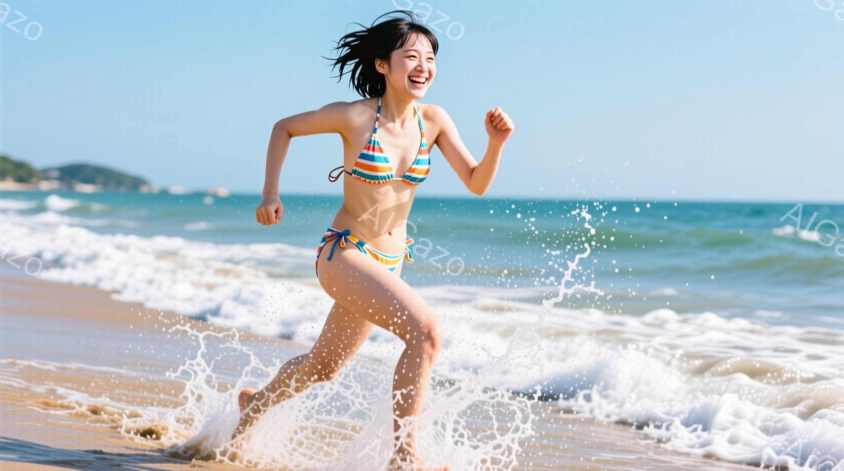この無料AI生成画像「金髪の女性が砂浜で高くジャンプしており、白いタンクトップと青い模様のスカートを身につけています。彼女は満面の笑みを浮かべ、片手を高く上げ、喜びを表現しています。背景には青い海と空が広がり、晴れた日のビーチの爽やかな雰囲気が伝わってきます。」は、2025年11月18日に作成されました。 サイズは 1664×928px の高解像度で、商用利用も可能なフリー素材として提供しています。