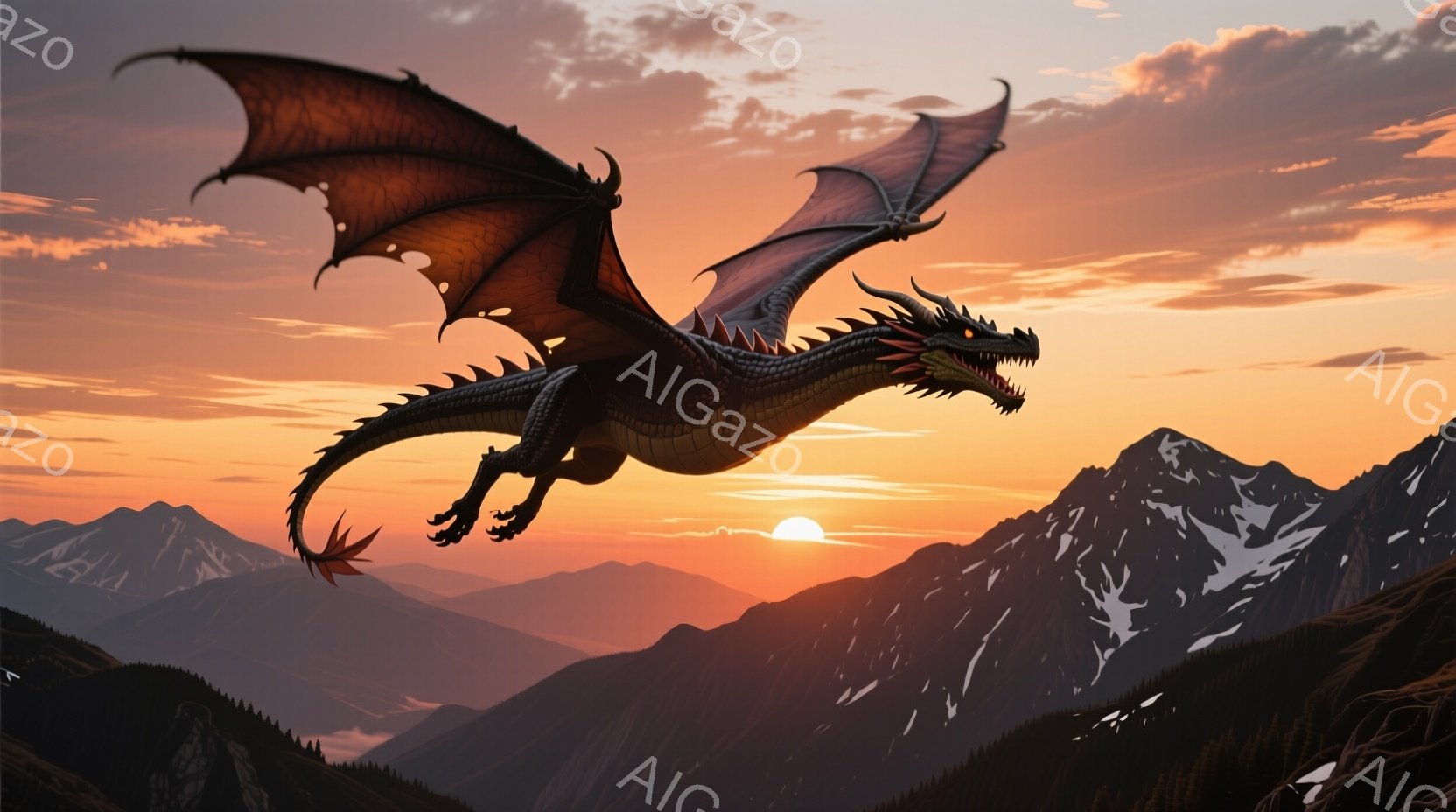 夕焼け空を背景に、巨大な黒いドラゴンが翼を広げて飛んでいる。ドラゴンの鱗は詳細に描かれており、鋭い爪と牙、そして燃えるような赤い目が印象的だ。遠くには山々が連なり、まるでドラゴンの王国を見下ろしているかのような壮大な景色が広がっている。