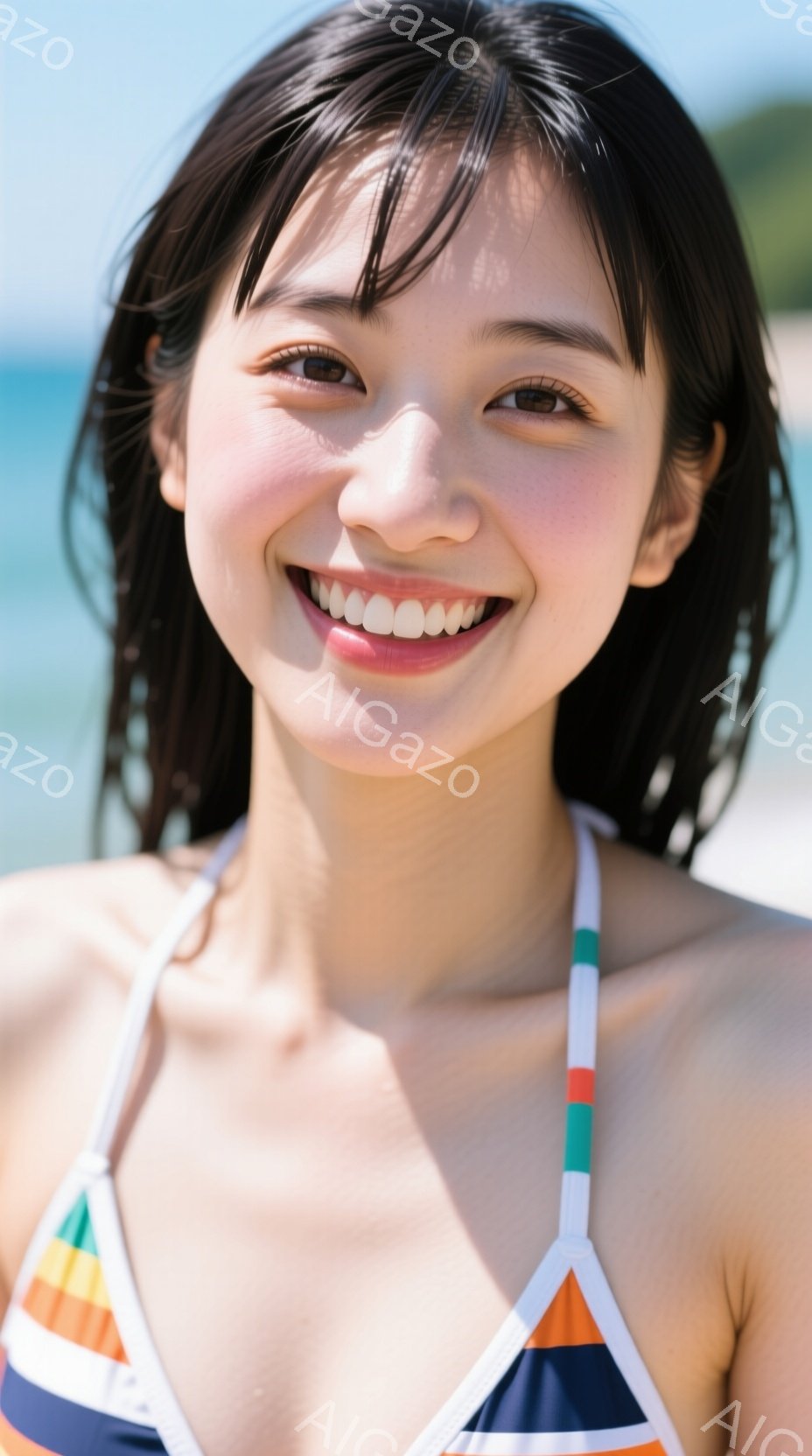 画像は、明るい笑顔を浮かべた若い女性のポートレートです。彼女はベージュ色のセーターを着ており、短めのダークブラウンのヘアスタイルです。背景には青い海と空が広がり、晴れた日の穏やかな雰囲気が感じられます。