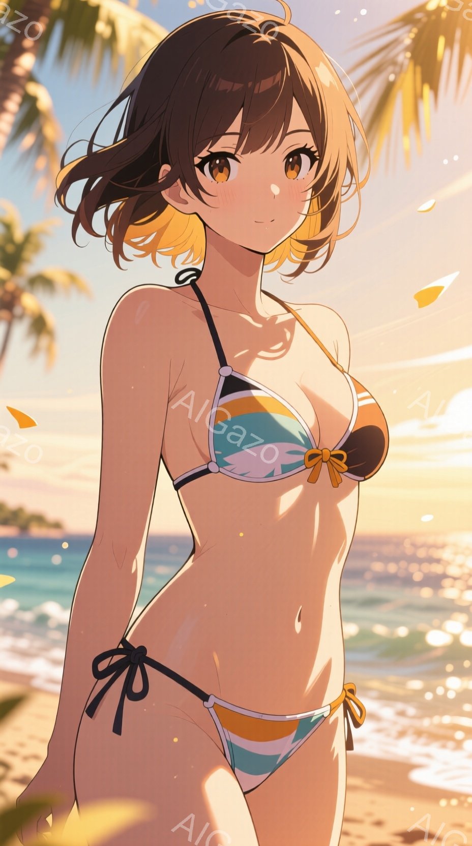 茶色の髪の女性が、ストライプのビキニを着て、明るい笑顔を見せています。彼女は少し上目遣いで、頬は赤く染まっており、元気で活発な印象を与えます。背景には青い海と白い砂浜が見え、暖かい日差しの中でリラックスした夏の雰囲気が漂っています。