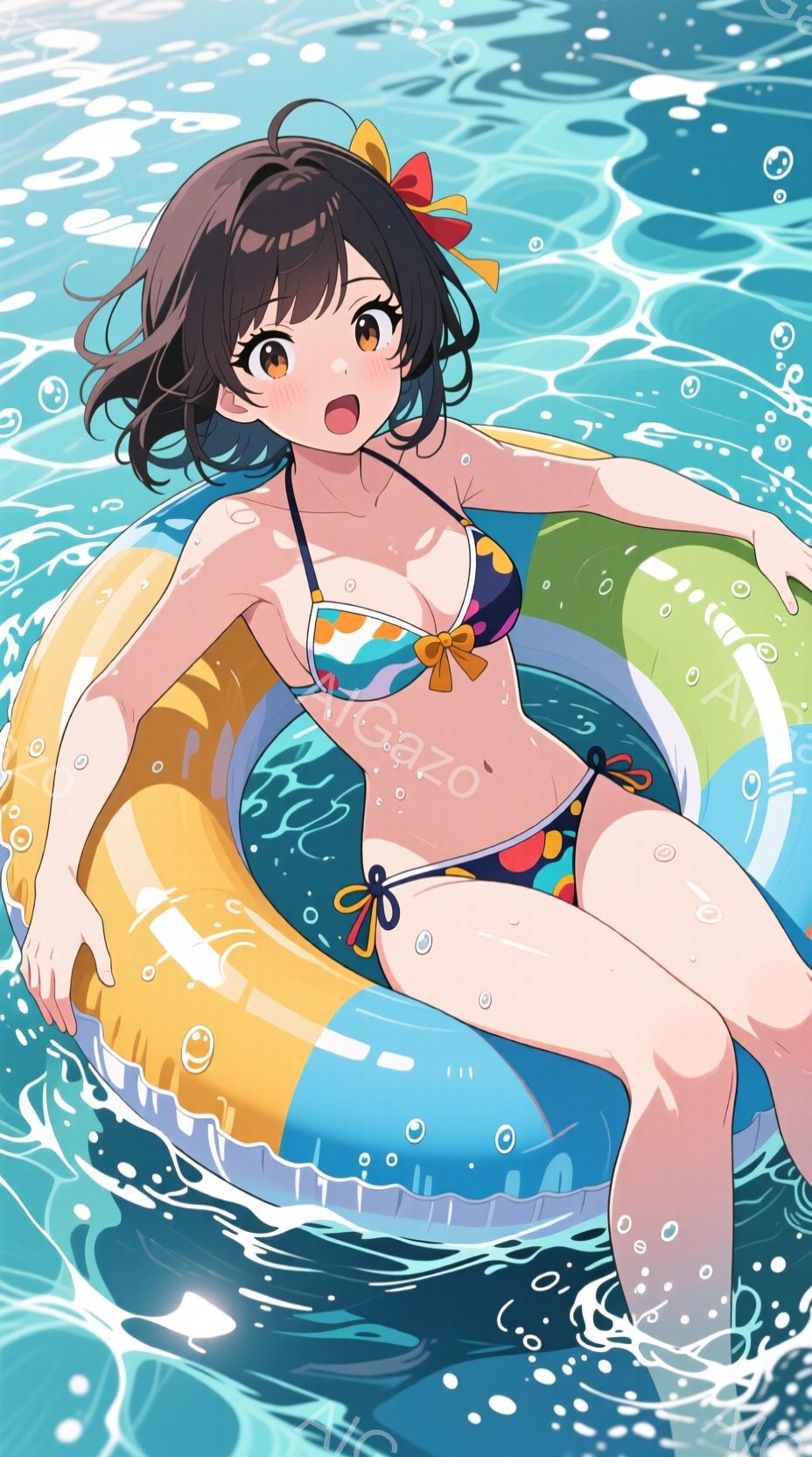 ショートカットの黒髪で、少し頬を赤らめた少女が描かれています。白いタンクトップに黒いショートパンツを着用し、プールの縁に座って足を浸けています。背景には青い空、ヤシの木、プールサイドの建物があり、晴れた夏の日のリラックスした雰囲気が漂っています。