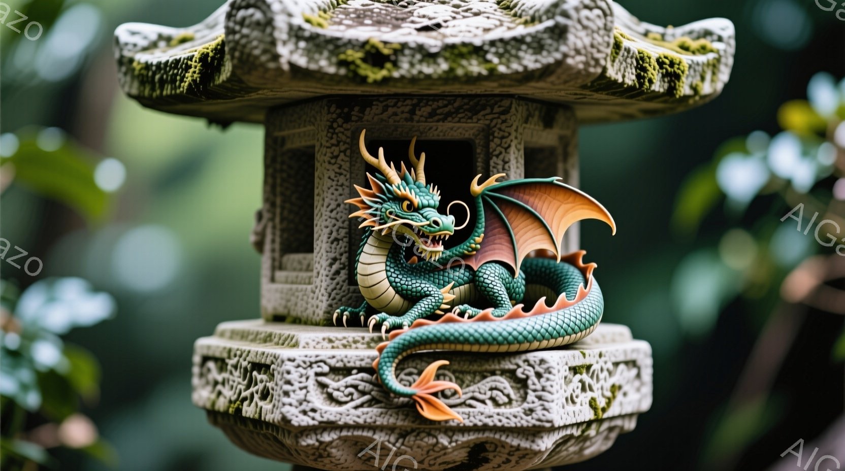 苔むした石製の灯籠の上に、青緑色の龍が巻き付いており、その鮮やかな色彩が目を引きます。龍は翼を広げ、まるで飛び立つ直前の躍動感あふれる姿で、細部まで精巧に彫り込まれています。背景は緑豊かな自然に囲まれ、静かで神秘的な雰囲気を醸し出しています。