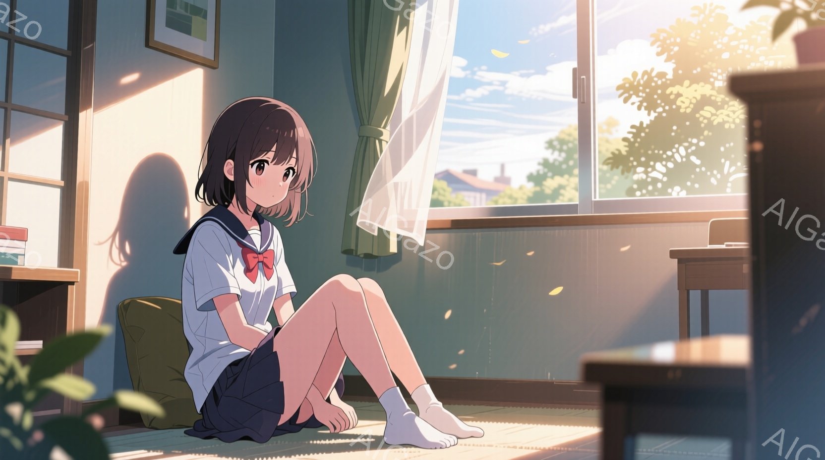 茶髪の少女がベッドに横たわり、制服を着ています。彼女は膝を曲げて足を組んでおり、窓の外の夕焼けの空を眺めています。部屋には木製の家具があり、背景には都市のスカイラインと燃えるような夕焼け空が広がっています。