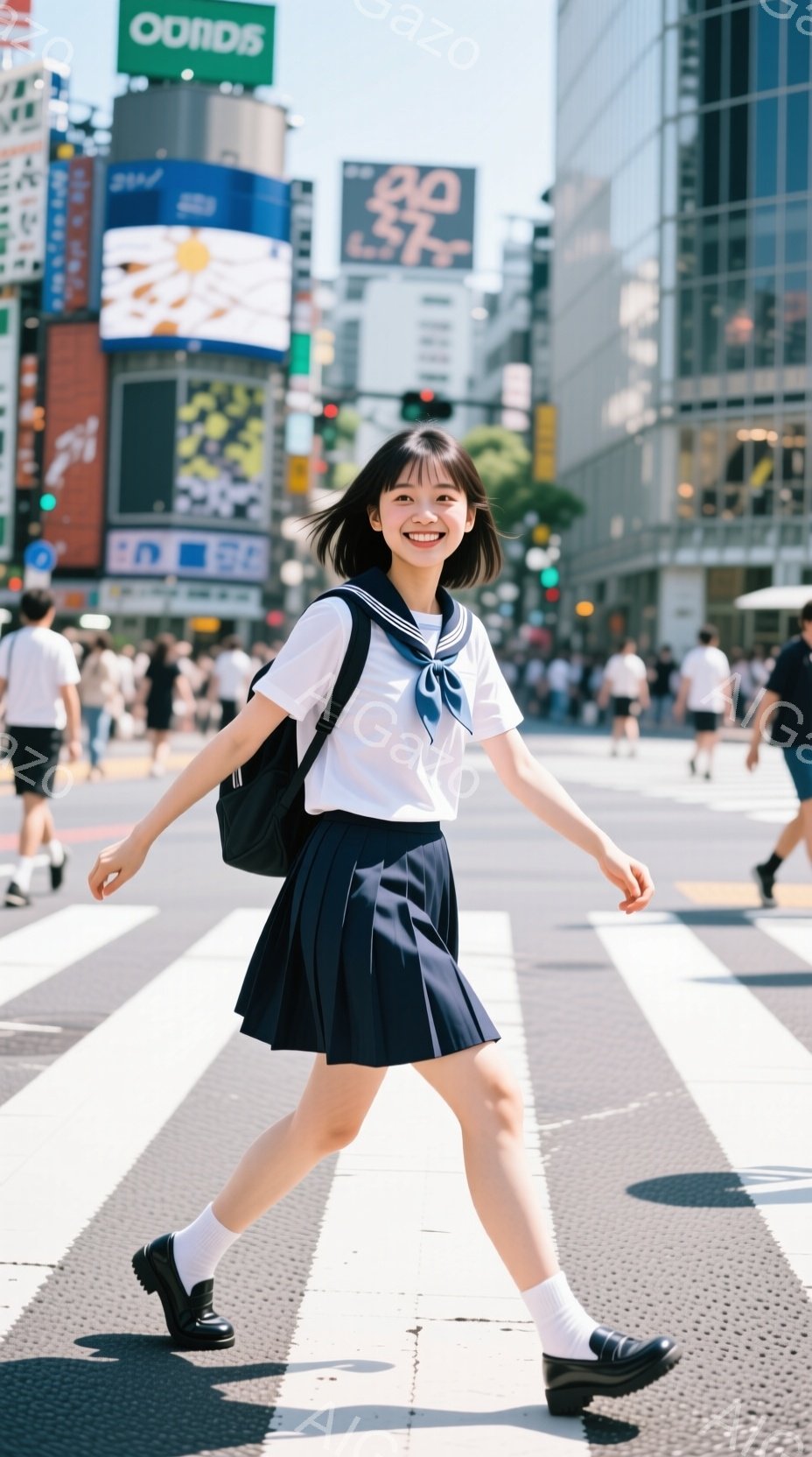 制服を着た女子高生が、渋谷のスクランブル交差点の横断歩道を歩いています。彼女は紺色のスカートと白いブラウスを着ており、髪は短く切りそろえられ、笑顔で正面を見ています。背景には高層ビルや広告看板が見え、多くの歩行者が行き交う賑やかな都会の風景が広がっています。