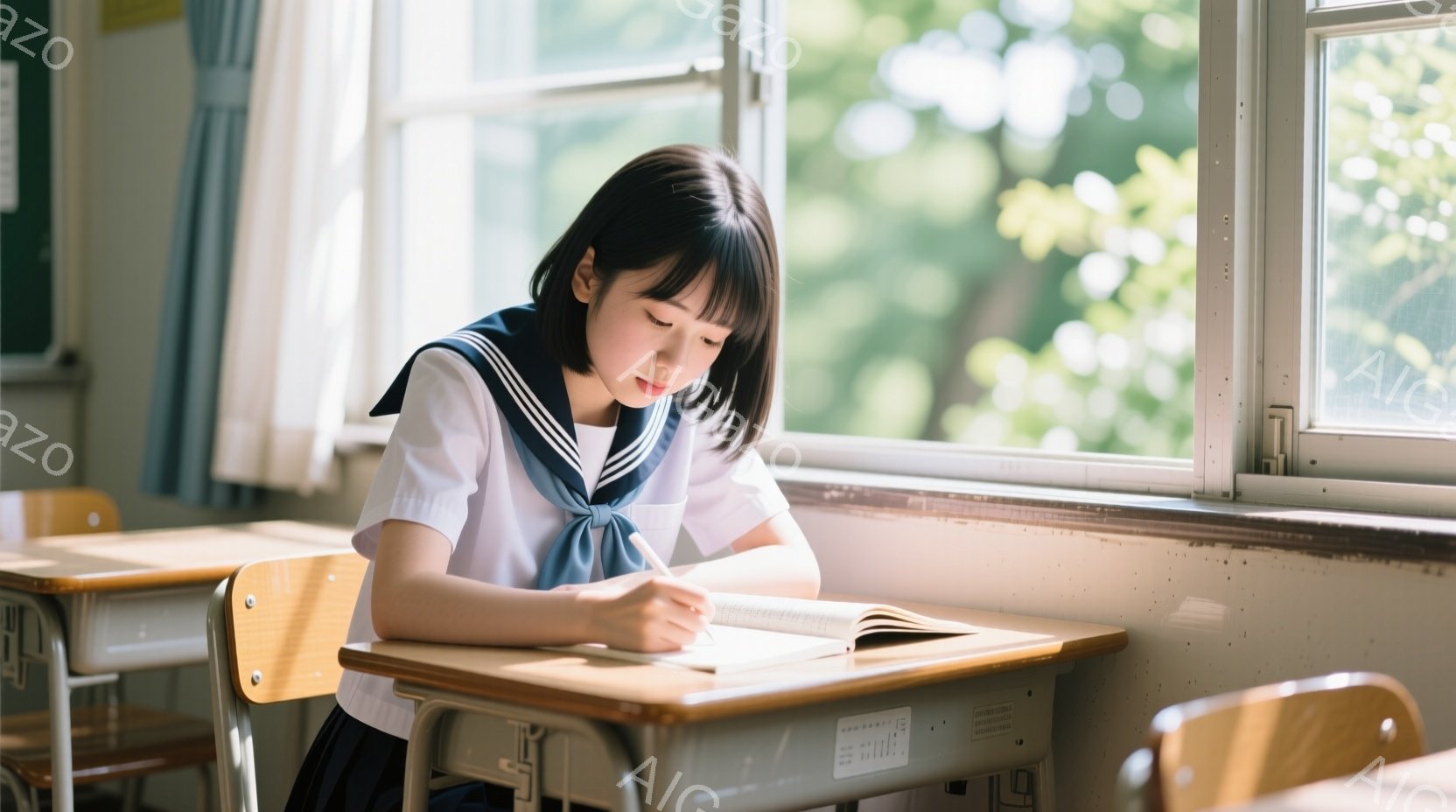 制服姿の若い女性が窓辺に立っており、カーテンを少し開けようとしている。彼女は紺色のリボンと白いブラウスを組み合わせた制服を着ており、黒髪を肩まで伸ばしている。背景には木製のナイトスタンドとベッドが見え、明るい自然光が差し込み、穏やかで落ち着いた雰囲気を醸し出している。