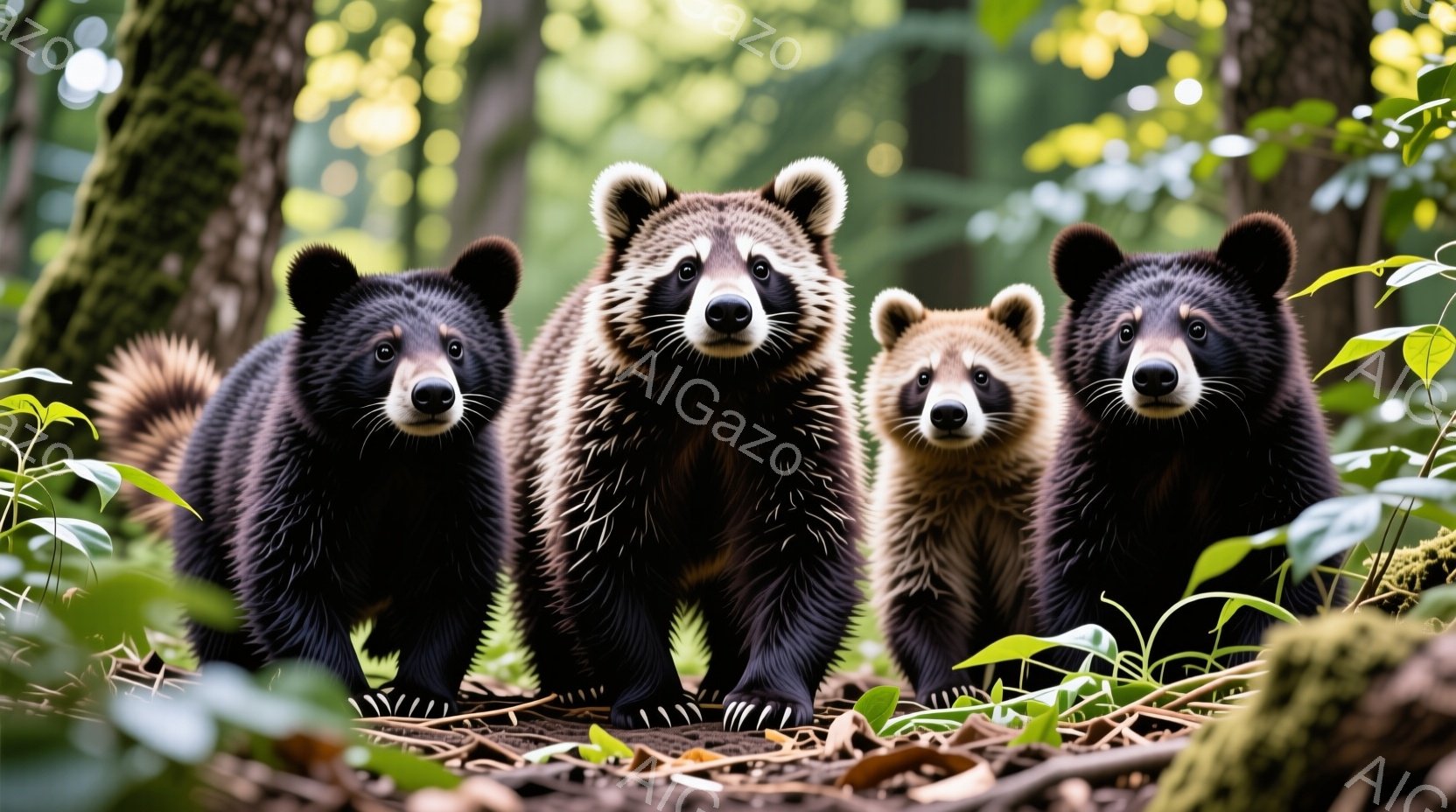 幼い熊が、苔むした木の幹にしがみついています。その毛並みは暗褐色で、光を受けて艶やかに輝いています。周囲は緑豊かな森林で、柔らかい光が差し込み、平和で自然な雰囲気を醸し出しています。