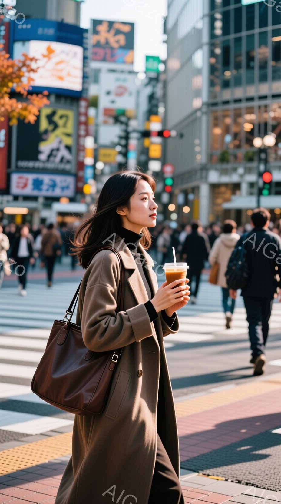 茶色のニットセーターと茶色のプリーツスカートを身につけた女性が、街路に立っています。彼女は少し微笑み、遠くを見つめており、髪は肩にかかる長さでゆるく巻かれています。背景には、紅葉した木々とレンガ造りの建物が見え、秋の穏やかな日差しが降り注いでいます。