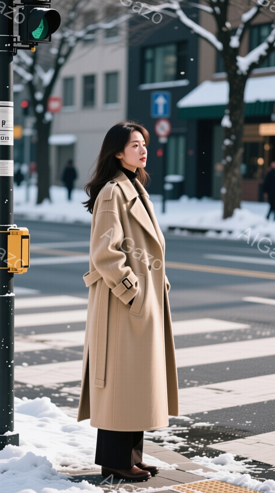 明るいベージュ色のオーバーコートを着た若い女性が、街路を歩いている。彼女は黒いタイツとブーツを履き、ダークブラウンのショートヘアで、少し憂いを含んだ表情をしている。背景には高層ビル群が立ち並び、地面には雪が積もり、賑やかな都市の冬の日の様子がうかがえる。