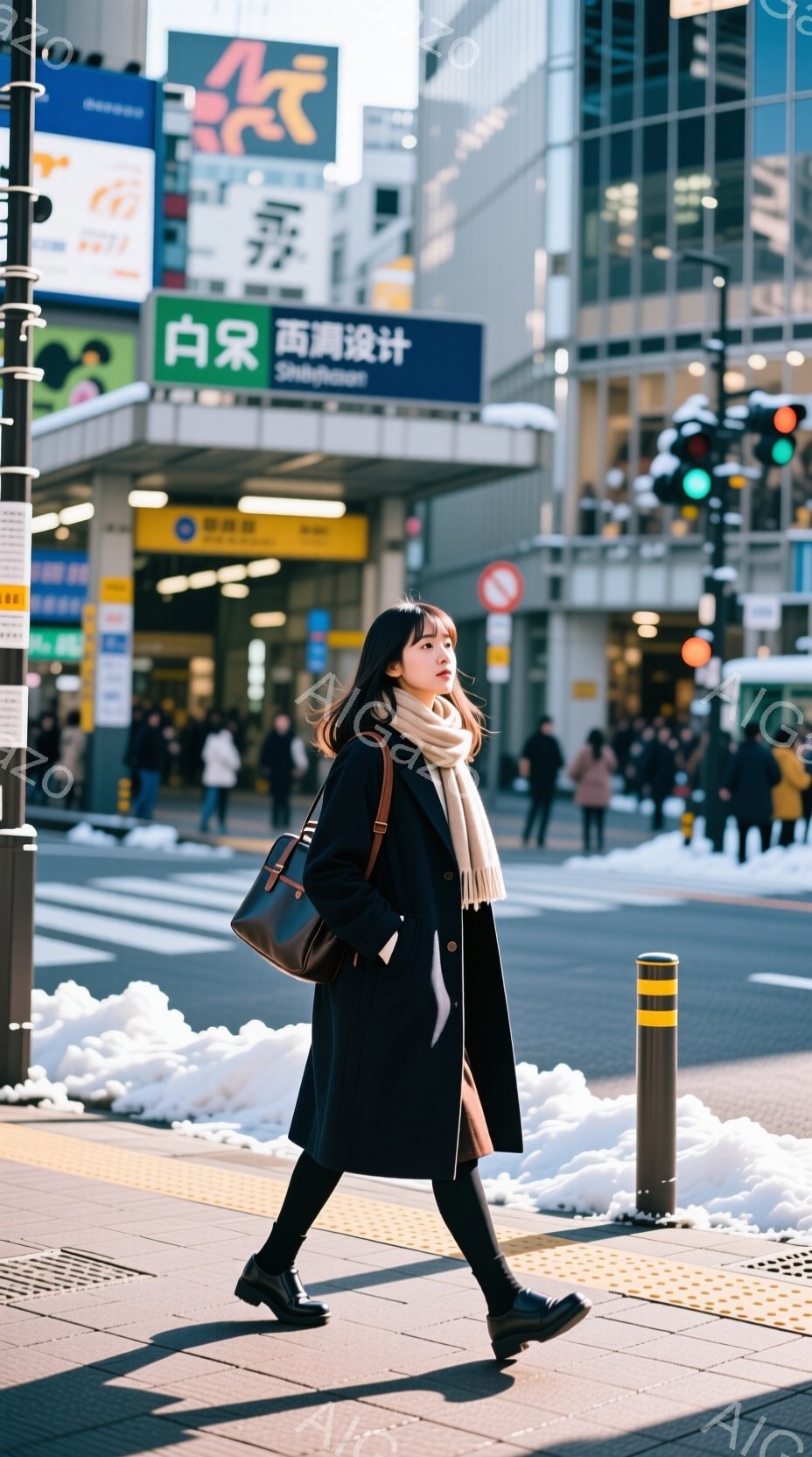 画像は、賑やかな東京の交差点で、制服を着た女子高生が歩いている様子を捉えています。彼女は白いブラウスと黒いプリーツスカート、ローファーを履き、肩にベージュのバッグをかけています。背景には高層ビルが立ち並び、多くの人々が歩いており、晴天で活気のある雰囲気です。