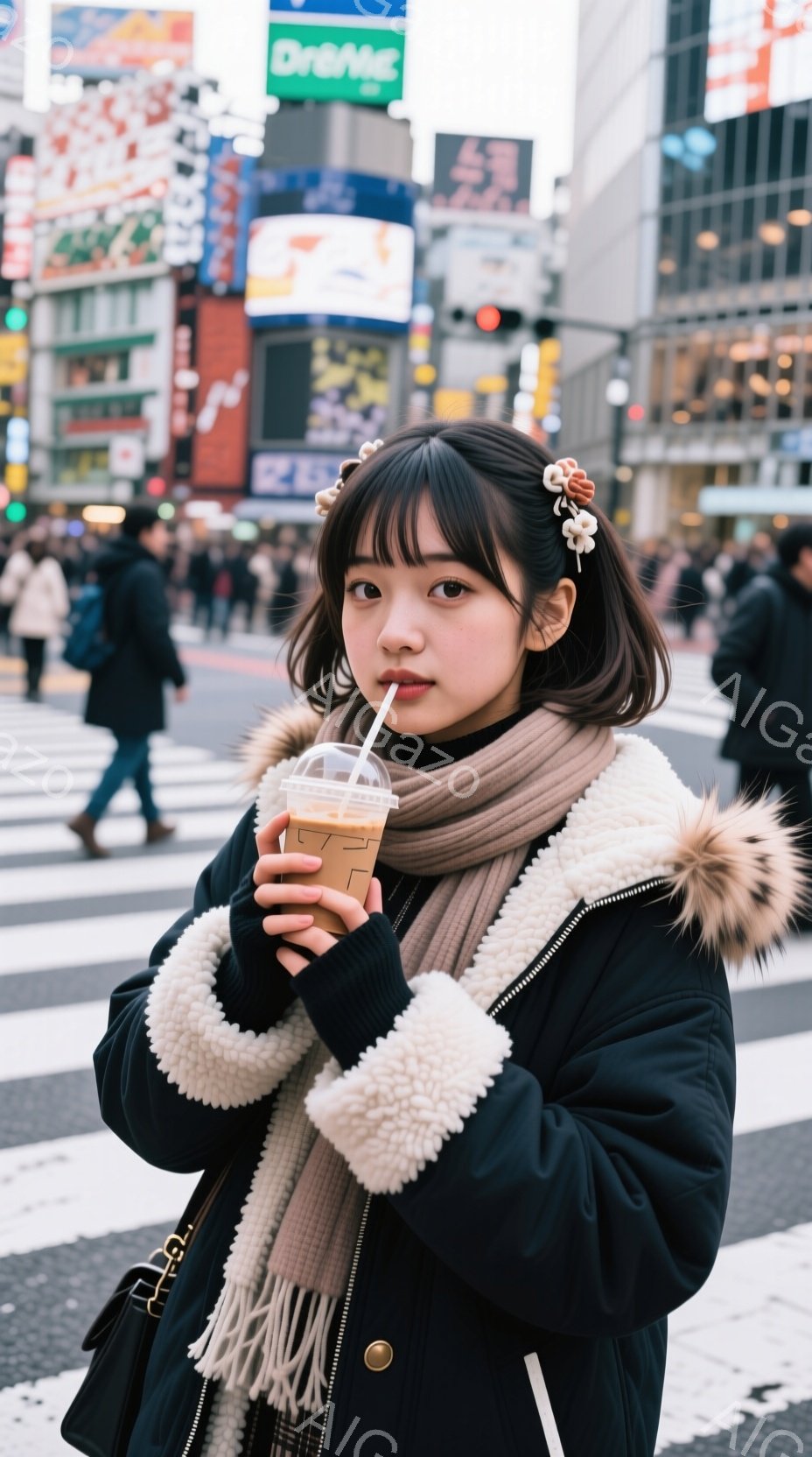 鮮やかな街並みを背景に、若い女性がふわふわの白いフェイクファーコートを着ています。彼女は黒のトップスに、カラフルなプリーツスカートを合わせ、首には複数のネックレスを重ね付けしています。ヘアスタイルは前髪を出し、ピンクのヘアアクセサリーをつけた可愛らしいスタイルで、表情は自信に満ち溢れています。
